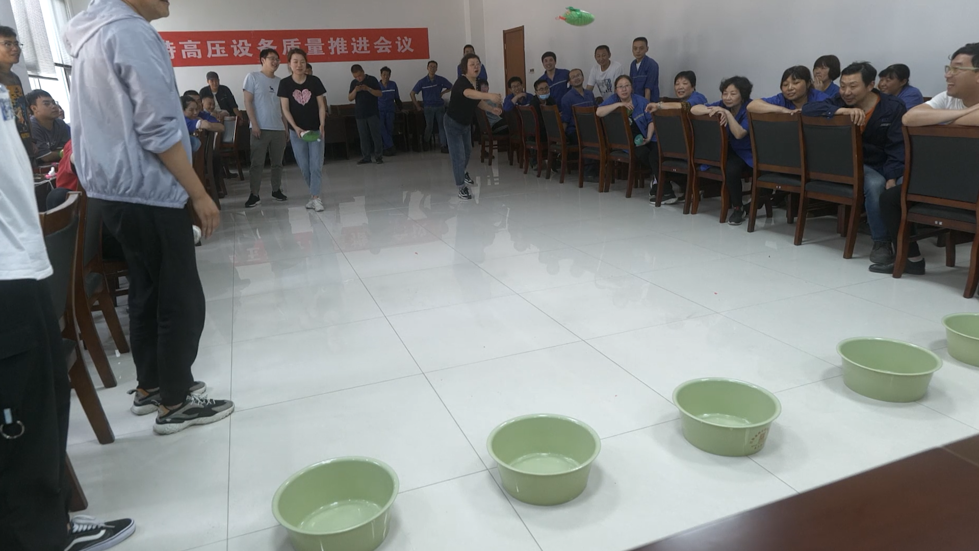第二个活动,射五毒。四人一组,投掷福袋进盆,投中数多者获胜,射五毒讲究稳和准,才能将福袋投入盆中,虽然大家中的不多,但都乐在其中。